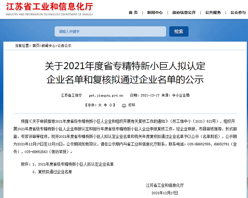 12月17日,江蘇省工業和信息化廳對2021年度省專精特新小巨人擬認定企業名單和復核擬通過企業名單進行公示,常州海圖科技憑借穩步的技術創新能力和非凡的市場表現成功入圍擬認定企業名單。